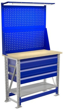 - Возможность дополнить верстак полкой (нагрузка 100 кг) и выдвижным ящиком (нагрузка 30 кг).