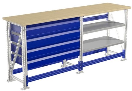 - Возможность дополнить верстак полкой (нагрузка 100 кг) и выдвижным ящиком (нагрузка 30 кг).
