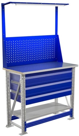 - Возможность дополнить верстак полкой (нагрузка 100 кг) и выдвижным ящиком (нагрузка 30 кг).