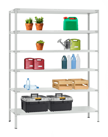 Полки стеллажей имеют стандартные размеры и могут крепиться к вертикальным стойкам с регулировкой по высоте. Разная высота стоек позволяет в сочетании с использование широкого выбора полок собирать стеллажи необходимых размеров и конфигураций. Конструкция позволяет быстро изменять высоту полок