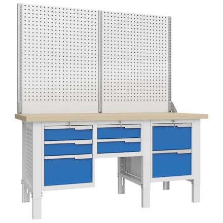 Распределенная нагрузка на рабочую поверхность 1500 кг.Рама верстака выполнена из профилированной холоднокатаной стали толщиной 2 мм. Столешница изготавливается из шлифованной влагостойкой фанеры марки ФСФ толщиной 40 мм, которая покрыта лаком-антисептиком. Усиление столешницы - опорная балка.Для удобства сборки модулей и рамы со столешницей в последней установлены резьбовые футорки. Фактическая глубина столешница 747 мм.Вместительность и вариативность